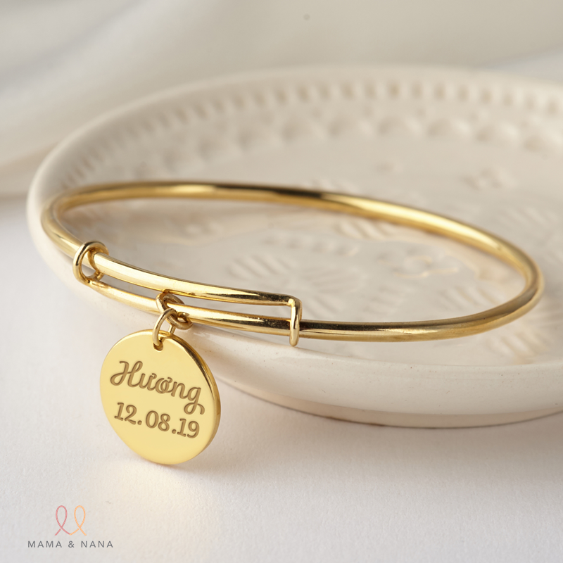 Nếu lắc tay dạng sợi có độ mềm mại, nhẹ nhàng thì kiềng tay bạc khắc tên lại có độ cứng cáp, chắc chắn. Không chỉ vậy, thiết kế này nhà Mama & Nana còn có thể co giãn theo kích thước tay của bé, chế tác tên bé và số điện thoại liên lạc khi cần nên bố mẹ hoàn toàn yên tâm lựa chọn làm quà tặng cho con.